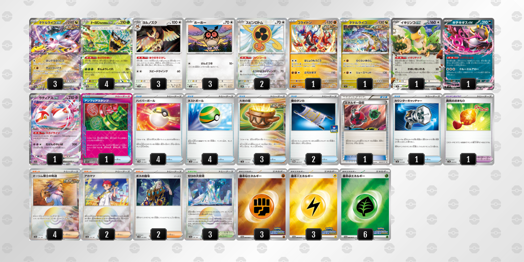 このデッキは、タケルライコexとオーガポンみどりのめんexを軸に、高速でエネルギーを加速し、強力なワザで相手を圧倒するデッキです。序盤はたねポケモンで展開し、中盤以降はタケルライコexの高火力ワザとオーガポンみどりのめんexの特性「みどりのまい」によるエネルギー加速で、相手を圧倒します。さらに、ヨルノズクによるドローで手札を確保し、状況に応じて柔軟に対応します。