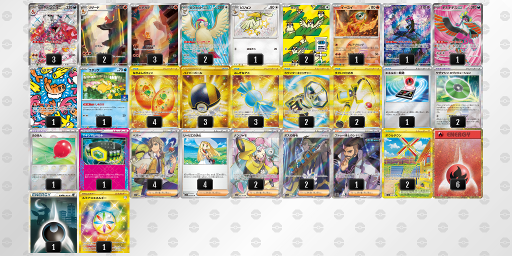 このデッキは、リザードンexの圧倒的な火力を活かし、相手を早期に撃破することを目指した、攻め重視のデッキです。序盤は、素早いポケモンの展開とエネルギー加速を行い、中盤以降はリザードンexによる高火力攻撃で一気に勝負を決めます。ピジョットexのマッハサーチによるサポートカードのサーチ、そしてキチキギスexの特性『さかてにとる』による山札加速も、安定した展開に大きく貢献します。